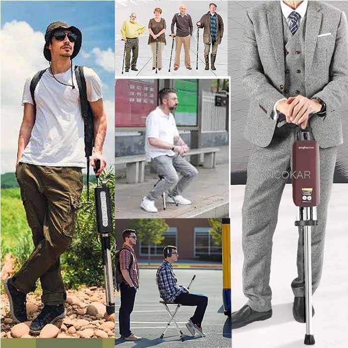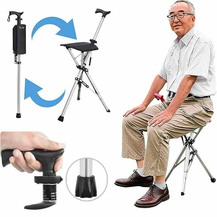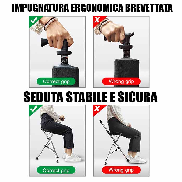 Dimentica l'ansia di cercare un posto dove sederti, In pochi secondi, trasforma il tuo bastone in una sedia stabile e sicura per riposare le gambe
