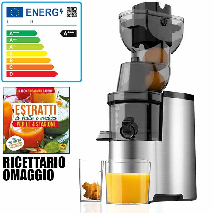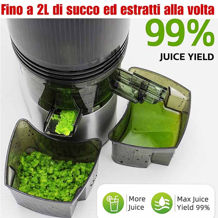 Il sistema e la nuova bocchetta Flip Gate è progettato per poter inseire frutta e verdura intere senza essere tritate, ma anche per impedire ai bambini di mettere le mani nell’apertura di riempimento. La sua capienza di 2L permette di inserire anche frutti interi come Mele, Pere, Carote, Banane e Arance. Inoltre separa in automatico, gli scarti, i semi e le bucce da polpa e succhi. Ottiene agevolmente succo e polpa da 1,5 kg di frutta o in un’unica sessione. E’ in grado di preparare fino a 2 litri succo o estratto di frutta o verdura conservando appieno tutti i nutrienti e le sue vitamine principali.
