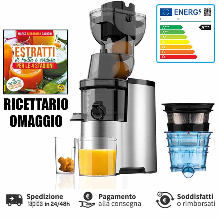 l’Estrattore 4 in 1 di frutta e verdura che estrae succhi, centrifughe e prepara Sorbetti, Gelati e Smoothie cremosi in metà del tempo. Approfitta della potenza di 1500 Watt, del motore silenzioso a BASSO CALORE e della Tecnologia per preparare in maniera veloce, mantenendo la freschezza degli ingredienti senza surriscaldarli e senza perdere i nutrienti. Gli elettrodomestici di 5° generazione come Juicy Power hanno un motore che gli consente di frullare con estrema facilità ingredienti duri come mele, carote, pere e zenzero e anche quelli morbidi come fragole o foglie verdi.