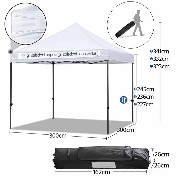 È il gazebo che cercavo, pesante, robusto, resistente e soprattutto impermeabile: in occasione di una fiera ha resistito alla grande ad una bomba d’acqua con grandinata, non si sono creati avvallamenti o conche d’acqua, nessuna infiltrazione. Attenzione al peso, si può anche aprire e chiudere da soli ma è davvero pesante. Ottima la sacca di trasporto con ruote seppure il telo va tolto ogni volta se lo si vuole riporre. Telo di buona qualità. Accessori in dotazione: sacche da riempire come contrappeso per le 4 gambe, ganci e corde di ancoraggio.