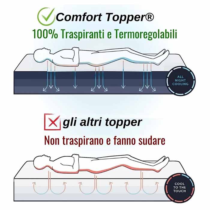 Il lussuoso Topper in Memory è l’unico ad avere sia il Lato Estivo che Invernale. Il primo in morbido cotone fiorentino traspirante per la stagione estiva, mentre il secondo per l'uso invernale più caldo e avvolgente.